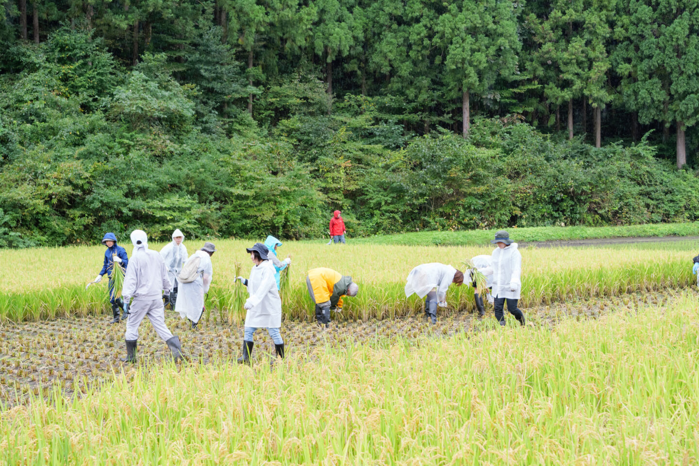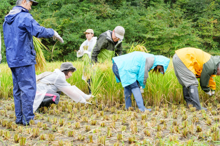 黄金色に実った田んぼを眺めながら、鎌を手に一株ずつ刈り取ります。秋の香りを胸いっぱいに感じながら、1年の恵みに感謝する時間。作業後には、蔵人たちと共に新酒や季節の八仙を味わいながら、収穫の喜びを分かち合います。